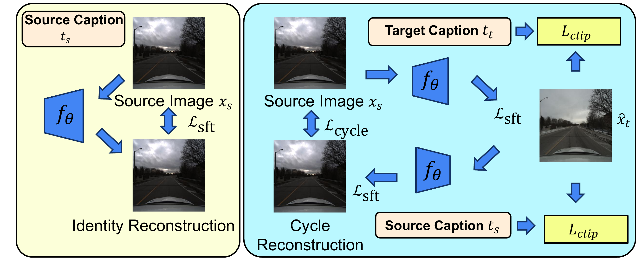 Training language-guided driving scene image editing: Our training pipeline supports both supervised training for paired images and unsupervised training for unpaired ones (e.g. downstream unseen real scenarios). We include three training objectives: supervised fine-tuning, cycle consistency, and CLIP loss.
